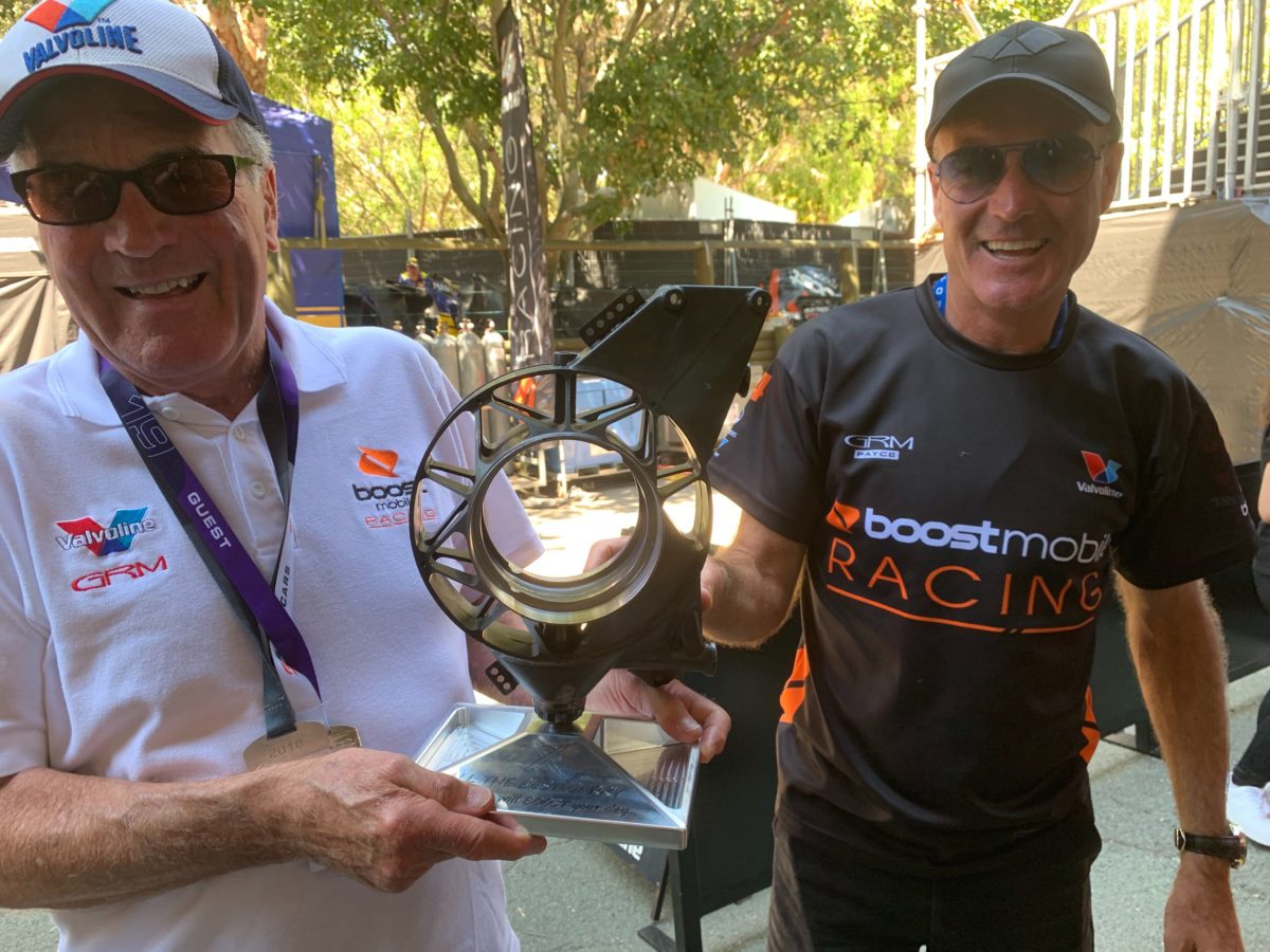 The factory Holden squad has created a trophy out of a front upright that has been placed on a plinth and engraved with the words ‘All the best Garry. Maybe this will boost your day’.