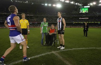 The pair was invited to conduct the coin toss in the middle of the ground as part of the Robert Rose Cup which is awarded to the winner of the Magpies/Bulldogs fixture each year.