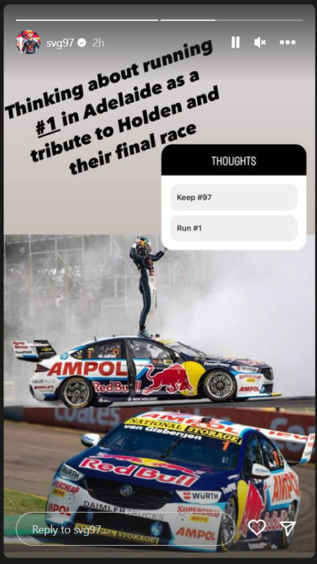 Van Gisbergen wrote, “Thinking about running #1 in Adelaide as a tribute to Holden and their final race,” and included in it a poll simply entitled “Thoughts”, with the option for his followers to vote either for “Keep[ing] #97” or “Run[ning] #1.”
