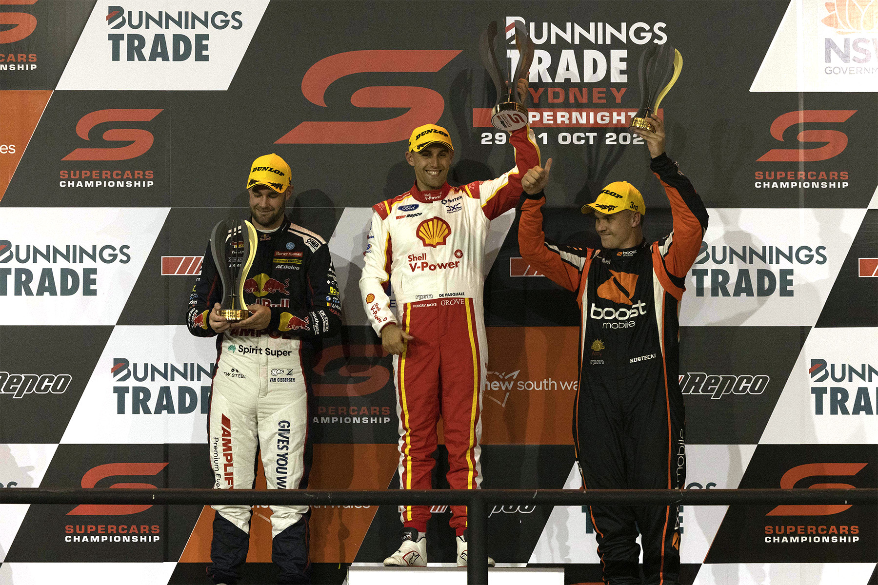 Race winner Anton De Pasquale was left standing alone on the podium when van Gisbergen and Kostecki exited the stage for the champagne celebrations.