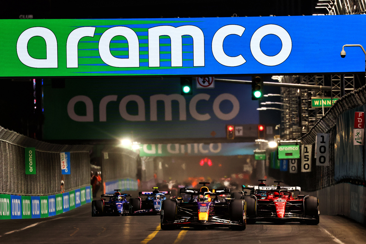 As the lights went out, Verstappen and Leclerc ran deep at the opening corner, the Dutchman taking the lead while both ran off the circuit.