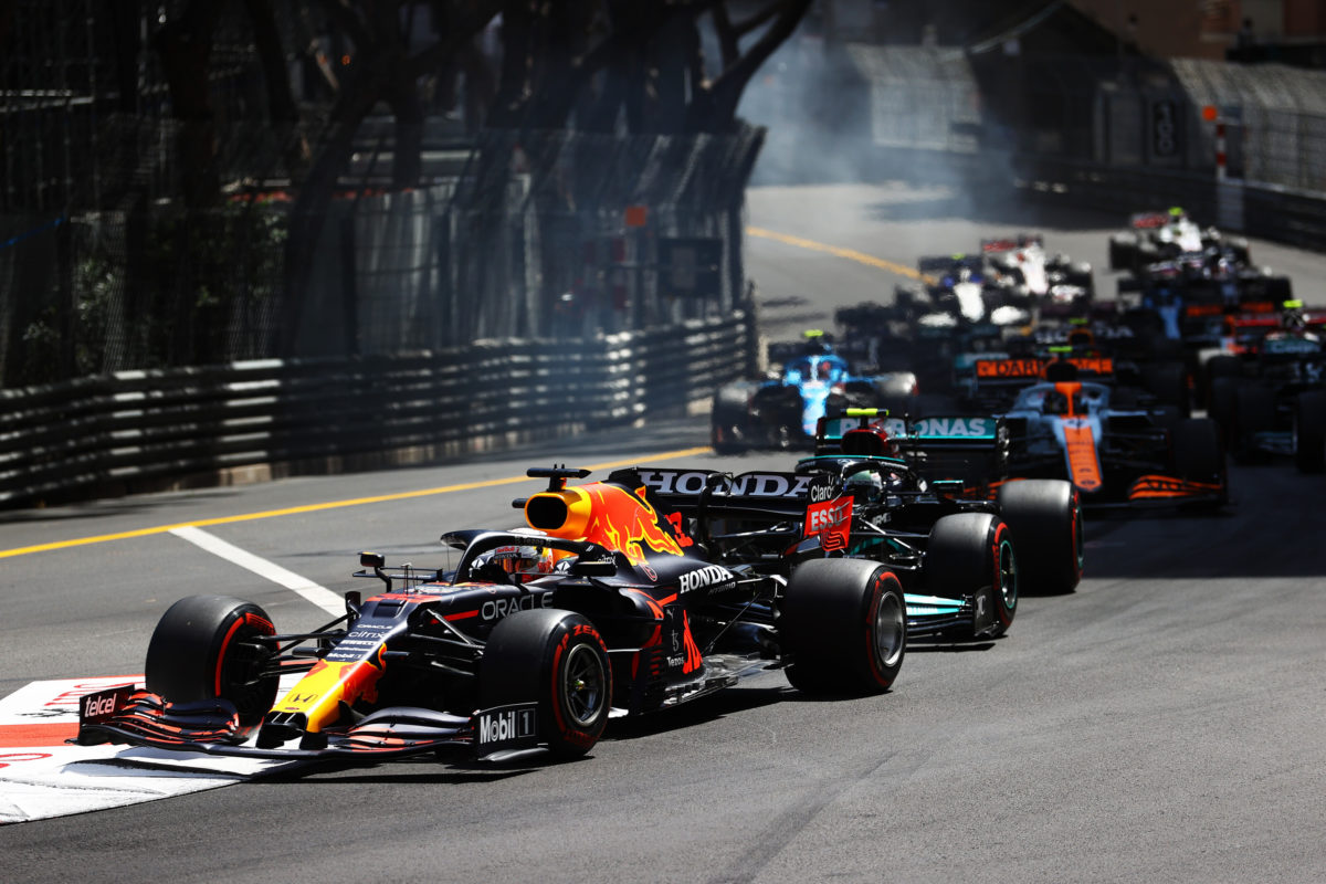 Charles Leclerc was missing from pole, the Ferrari a non-starter, leaving Verstappen to cover off Bottas on the run to Ste Devote for the first time.