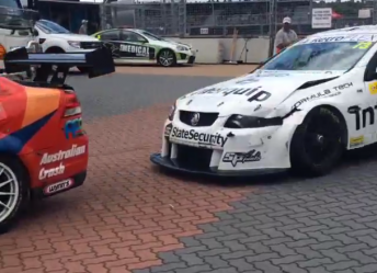 The clip posted by an Instagram user shows Brett Stewart’s Holden charging towards the car of rival Josh Kean as the field returned to the paddock after Race 2.