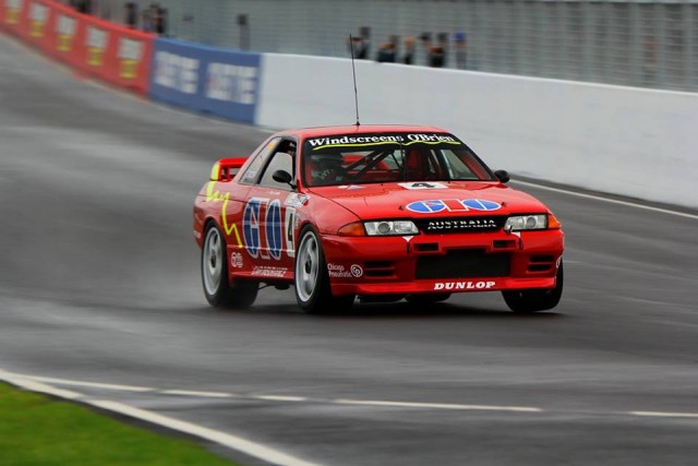 Terry Lawlor’s Nissan GT-R took a commanding pole position for the Heritage Touring Cars at a rain hit Bathurst Motor Festival.