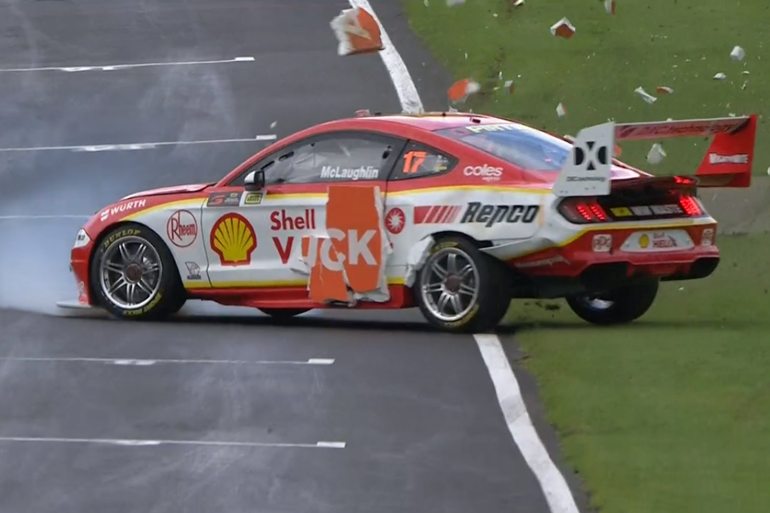 On full lock, he managed to keep the #17 Shell V-Power Mustang off the concrete walls, escaping with what appeared to be only minor damage to the rear bar as he cleaned up a foam advertising sign.