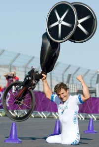 The Italian beat Germany’s Nobert Mosandl by more than 27 seconds at the iconic Brands Hatch motor racing circuit in the 16-kilometre H4 handcycling time trial.